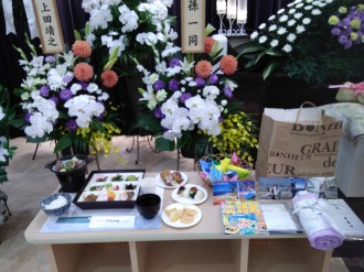 故人様の好物の蕎麦、お寿司。旅行好きで、ご家族様と1年に1回は旅行で思い出作りをしていたそうなので、私からは旅行券をお供えさせていただきました。