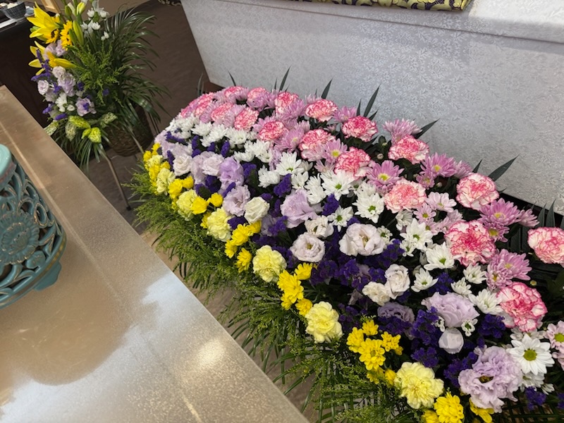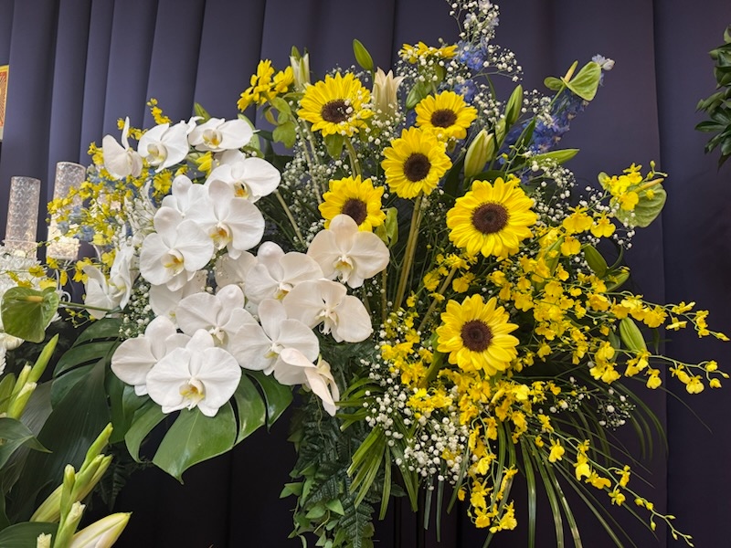 季節は夏。 ひまわりが入った枕花をお供えいただきました。