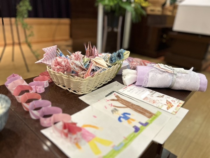 お孫様、ひ孫様からのお手紙やメッセージカード、折り鶴などを皆様方の手でお手向けいただきました。