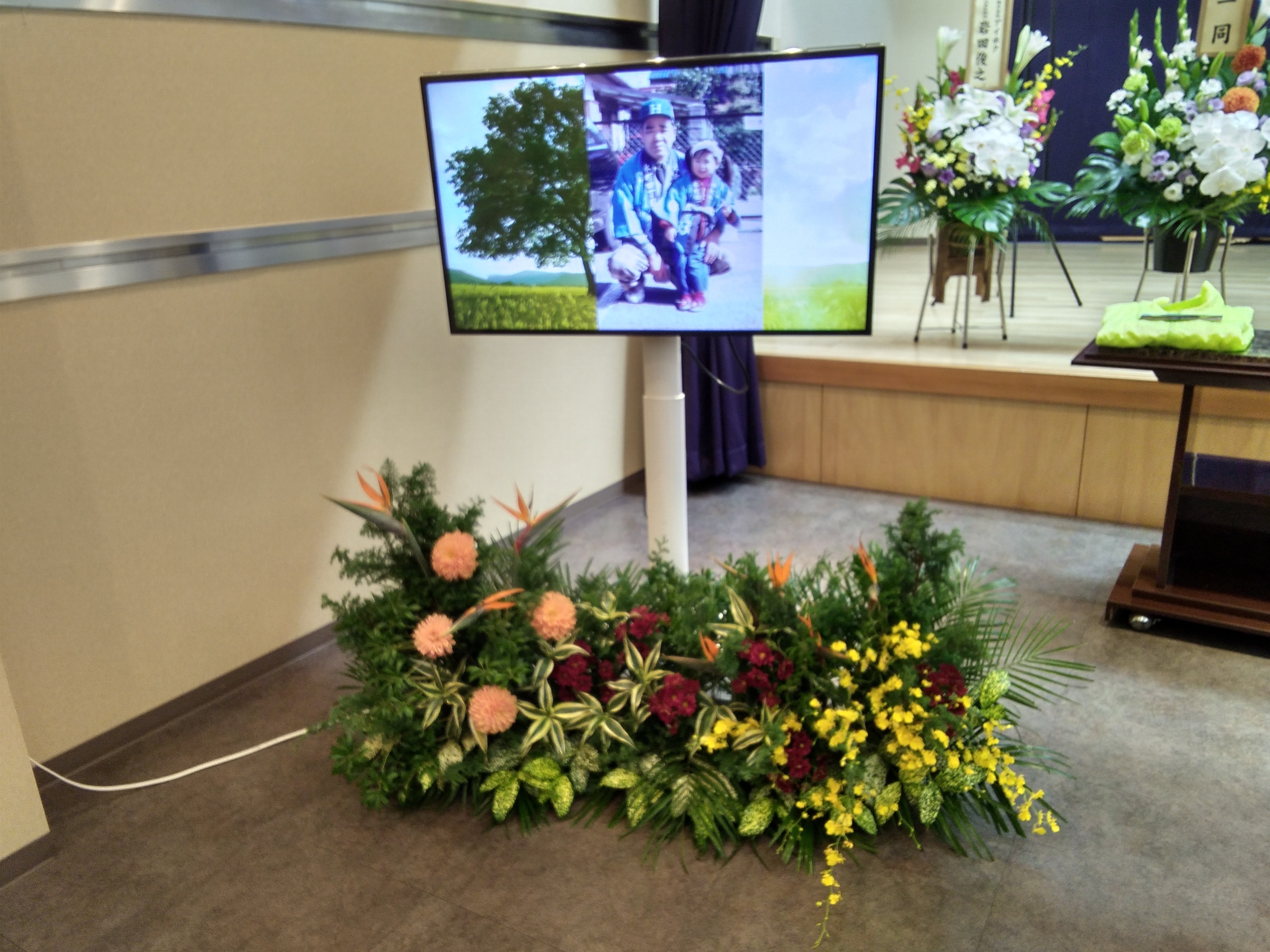 お式の様子です。今回はエターナルソングのご注文の依頼がありまして、故人様の人となりや家族との思い出を歌詞にしたオリジナルソングです。ご家族様は映像を見ながら思い出話に花が咲いていました。