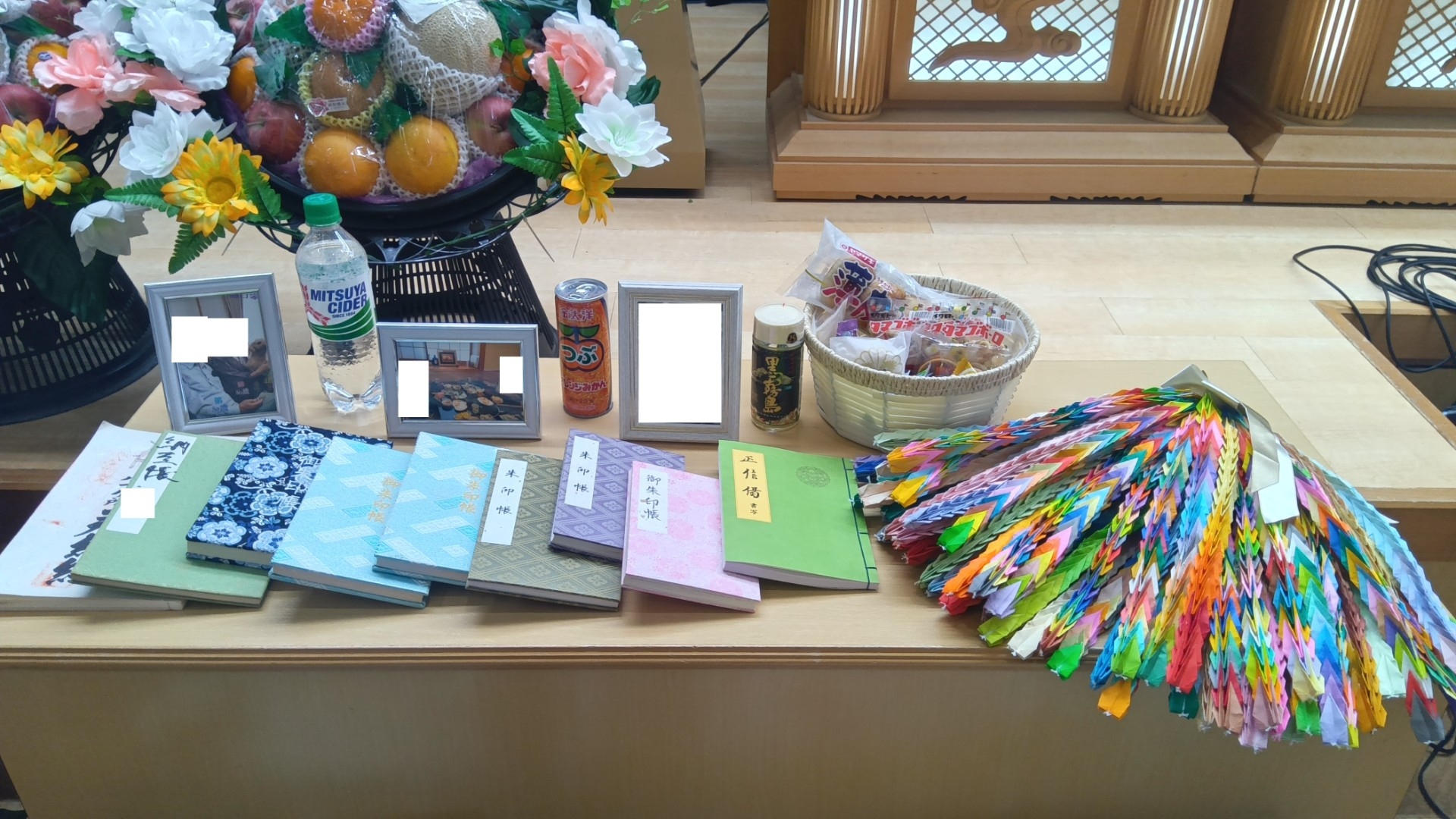 故人様のお近くには、朱印帖や思い出の写真、千羽鶴など、
