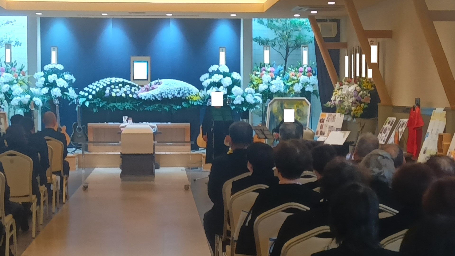 飾られ、祭壇近くにはギターや絵が飾られました。