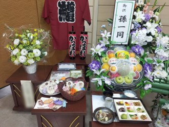 ご親戚やご勤務先様からたくさんのお供えの花や果物が届けられとても華やかな雰囲気になりました。