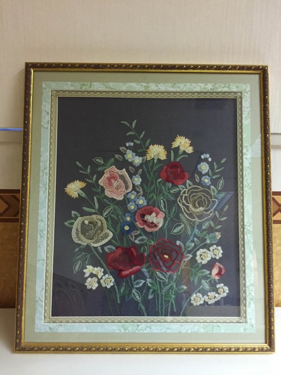 3つ目のお花の刺しゅうの作品は、そのままご遺影写真の背景として使わせていただきました。