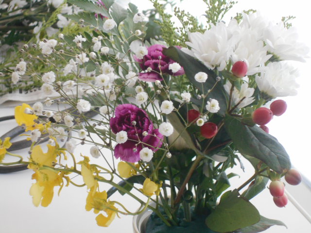 チャームフラワーアレンジメントです。皆様は笑顔で思い思いにお花を生けてらっしゃいました。