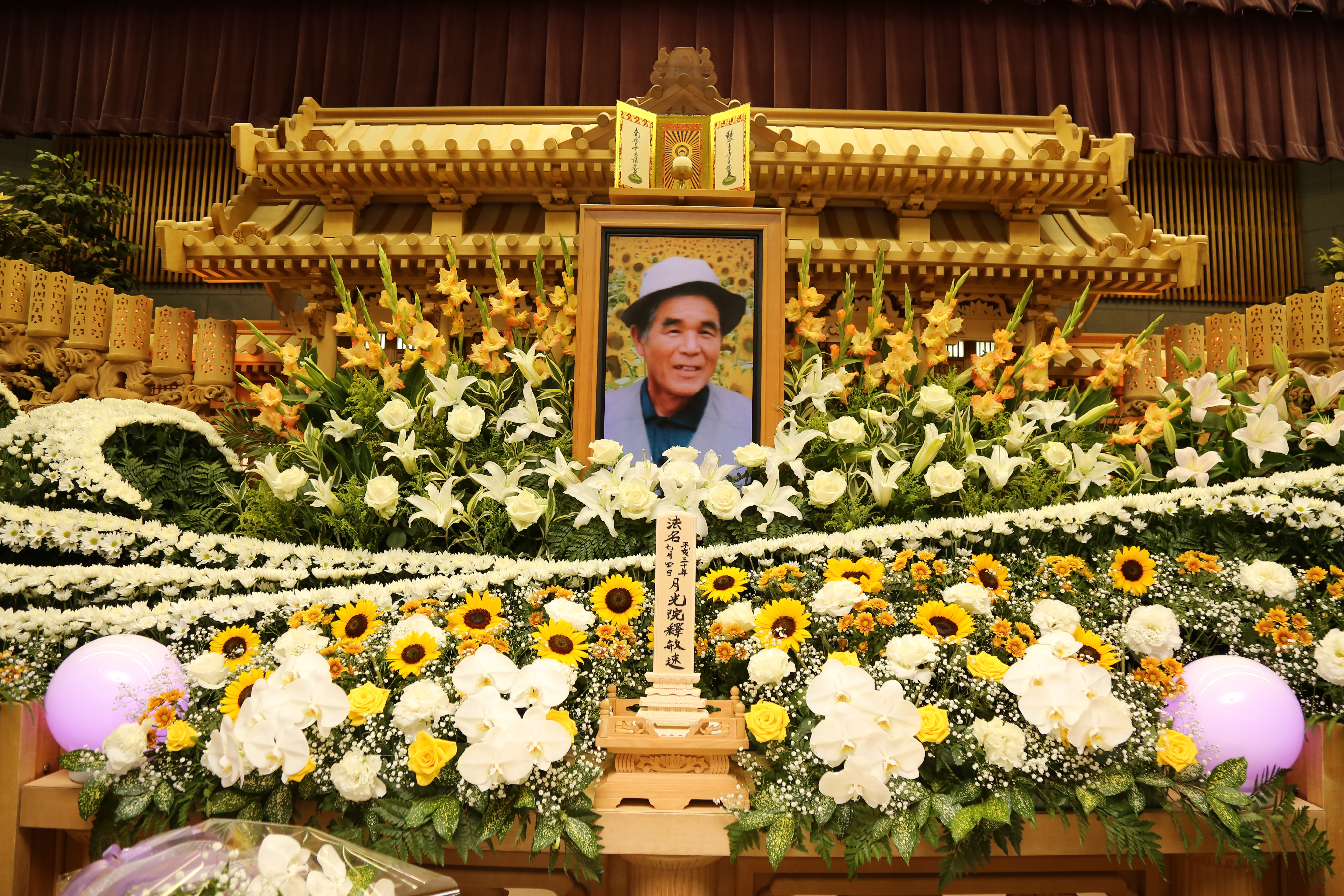 ひまわりが印象的な、立派な祭壇でございます。ご遺影はお孫さんと一緒に撮影された際の、優しい笑顔のお写真を選ばれました。この表情がおじいさまらしい、とご家族皆様で決められていました。