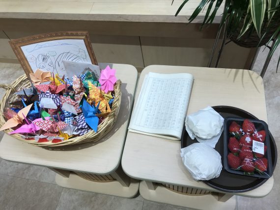 こちらのお供物は右からお好きだった苺とお供えの仏飯、そして写経とお部屋で皆様に折っていただいた折り鶴でございます。