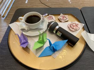 私どもからは、コーヒーとカラオケがお好きとお伺いしましたのでカラオケマイクを作り、コーヒーと一緒にお供えをさせていただきました。