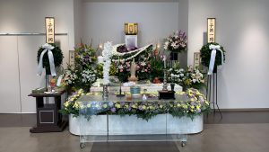 こちらは流星というお花の祭壇です。お棺の周りにもたくさんのお花をお飾りさせていただきました。周りのお花は「フラワーヘッド」というお飾りになります。