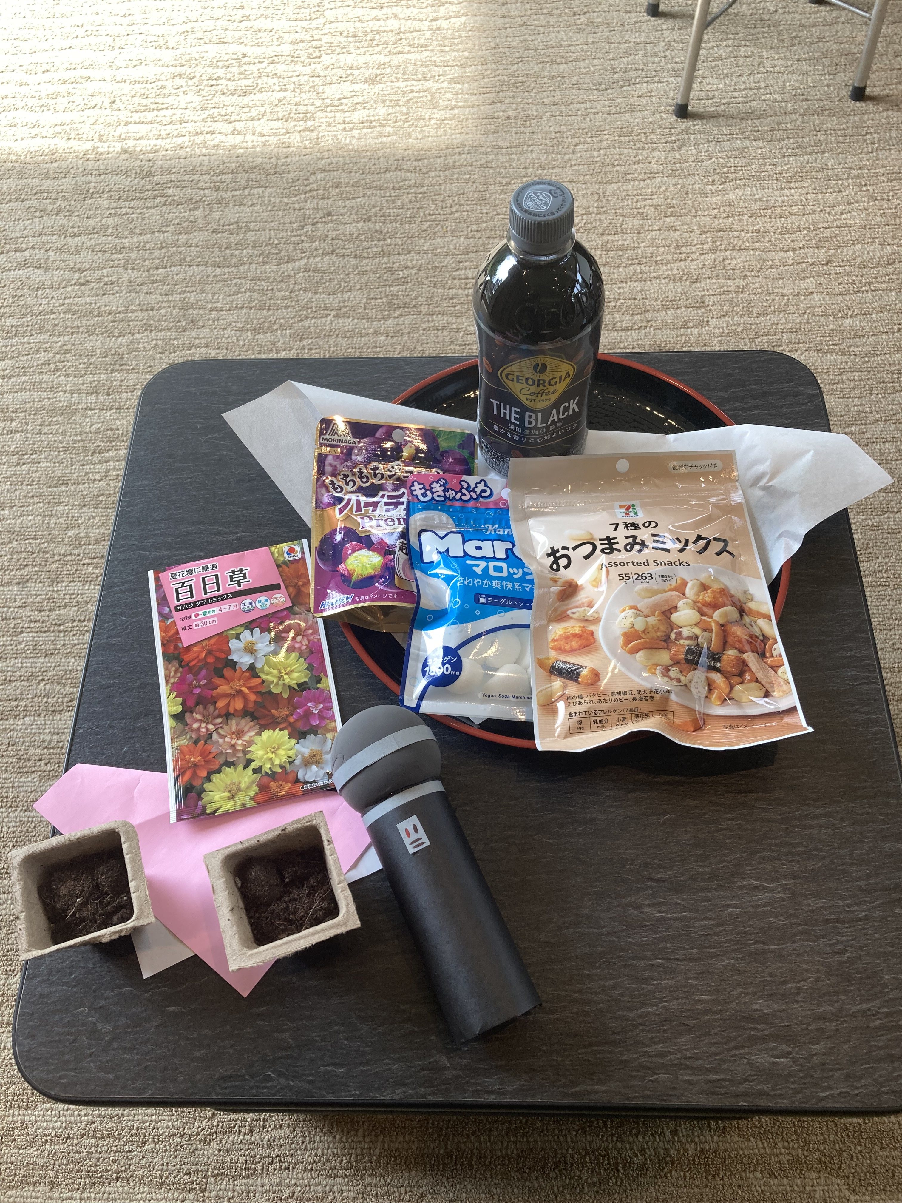 お花の種とプランター、ご一緒にご火葬できるよう燃える素材でお作りいたしましたマイクをお供えさせていただきました。