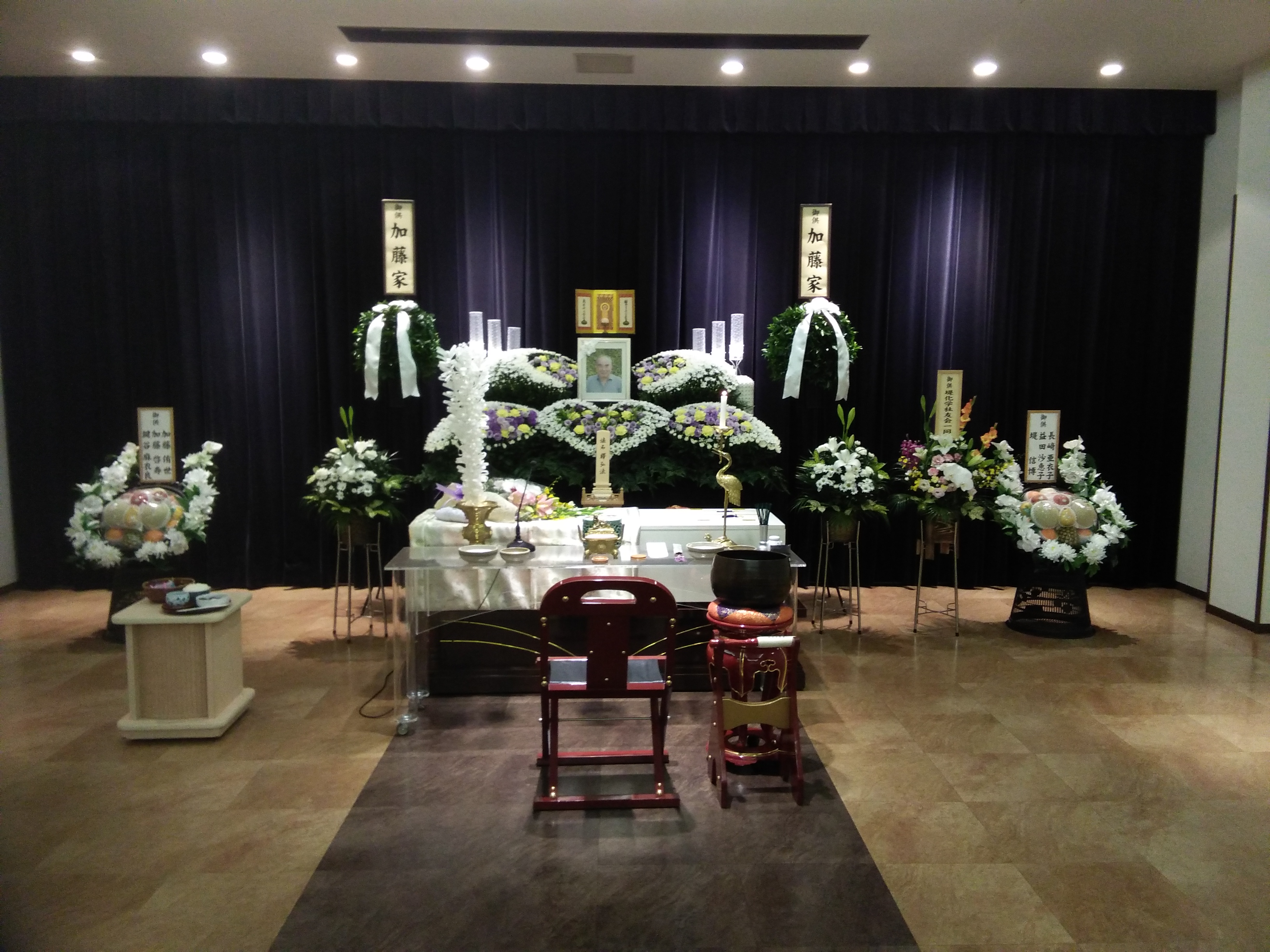 【ひいらぎ】という祭壇コースをご用命いただき、親族様の人数も加味して式場にお飾りをさせていただきました。