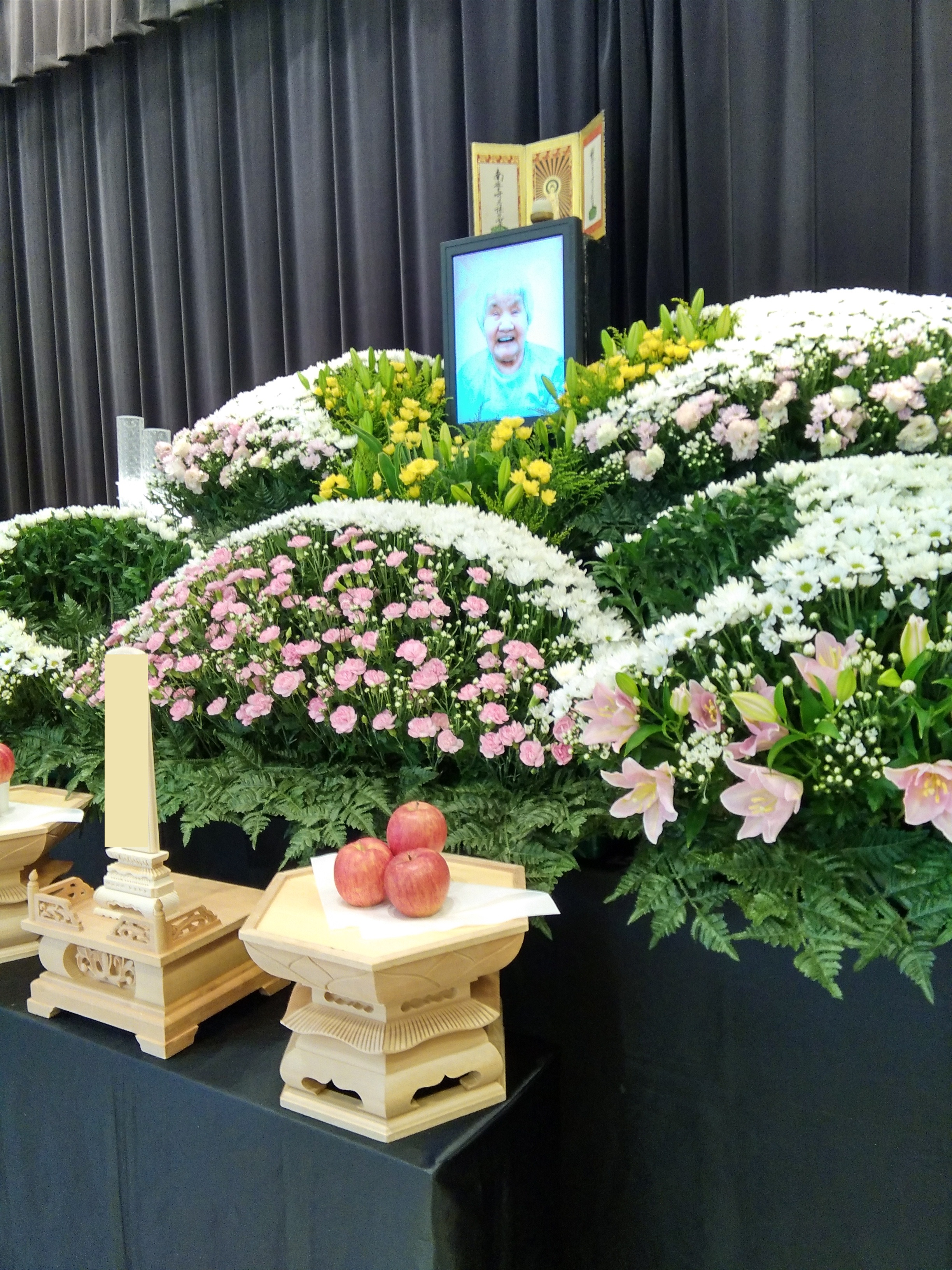 今回のお葬儀では白木祭壇ではなく、お花のみで作られた花祭壇を飾り、故人さんをお見送りいただきました。