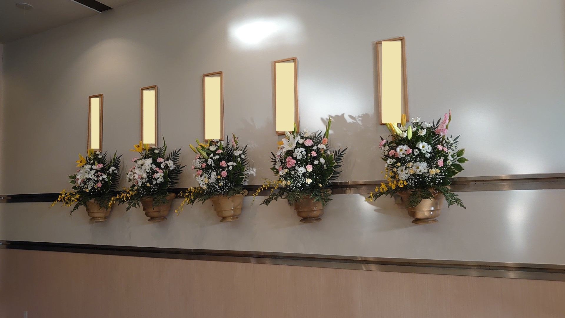 皆様からお供えで頂いたお花は祭壇横の枕花だけでなく、壁にも飾りつけお花に沢山囲まれていました。