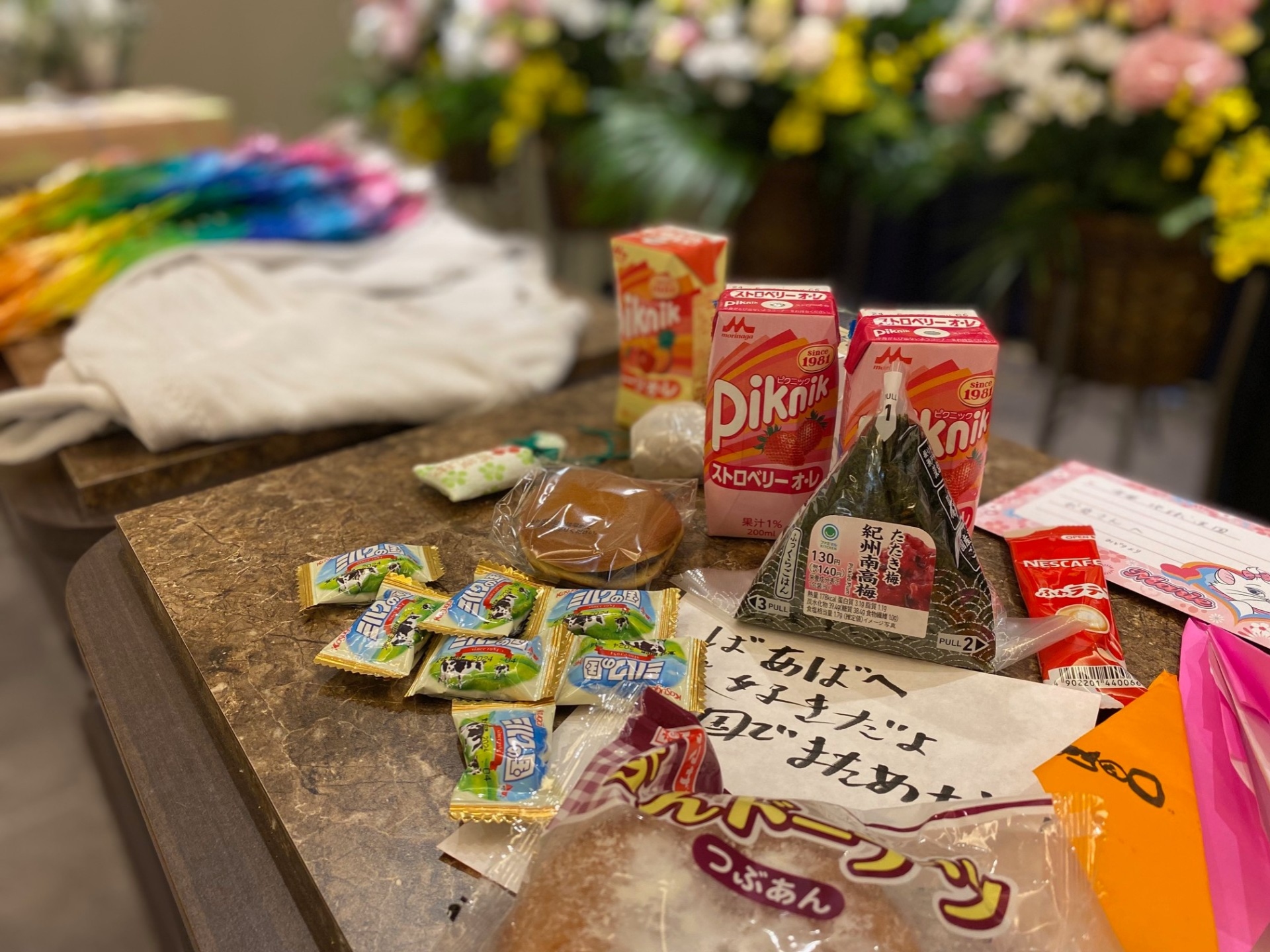 故人様のお近くには、長女様がお作りされた千羽鶴、愛用のカーディガン、そして、お孫様やご家族様からのお手紙、大好きだったお飲み物やおにぎりなどお供えいただきました。