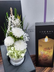 こちらは【華~プリザーブド仏花とLEDロウソクセット~】でございます。特殊な加工を施されたプリザーブド仏花と可愛らしくお花が装飾されたLEDロウソクでございます。