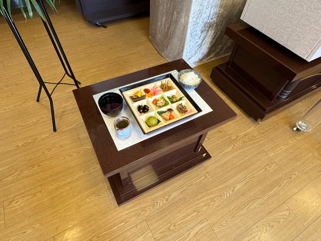 陰膳でございます。お別れの際にお柩に手向けていただきました。