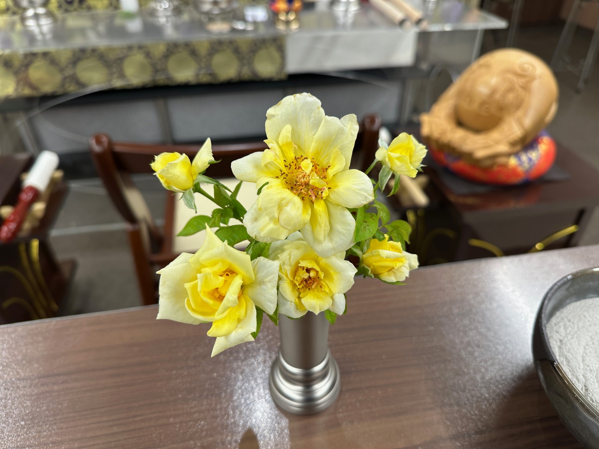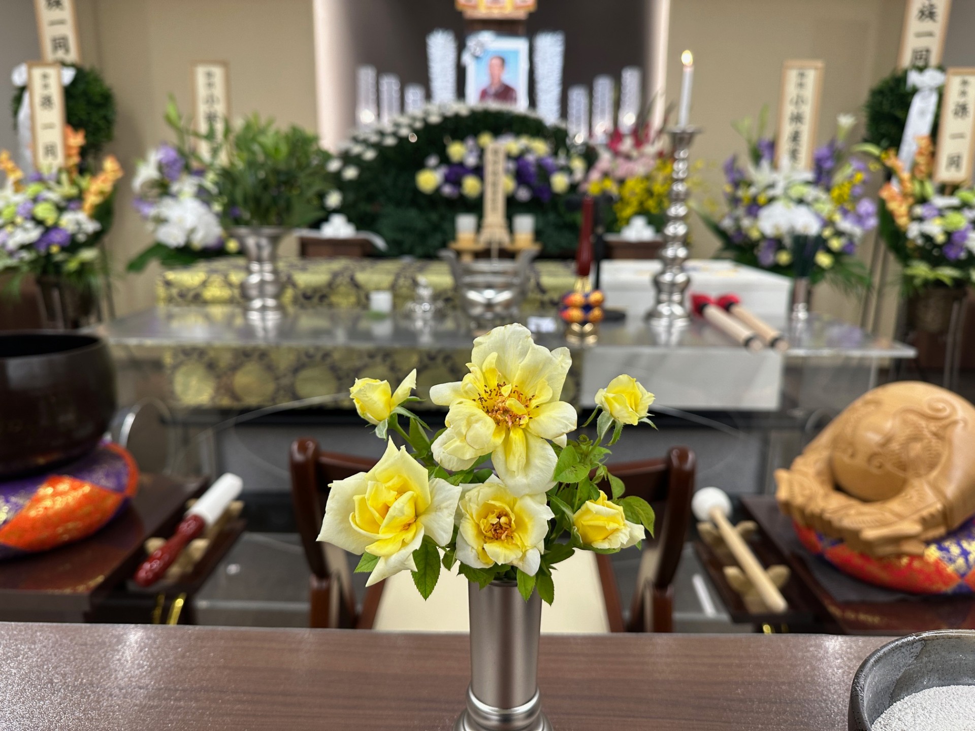 また、ご自宅のお庭で咲いた薔薇の花を、皆様にもご覧いただけるよう焼香の香炉の近くに飾り、