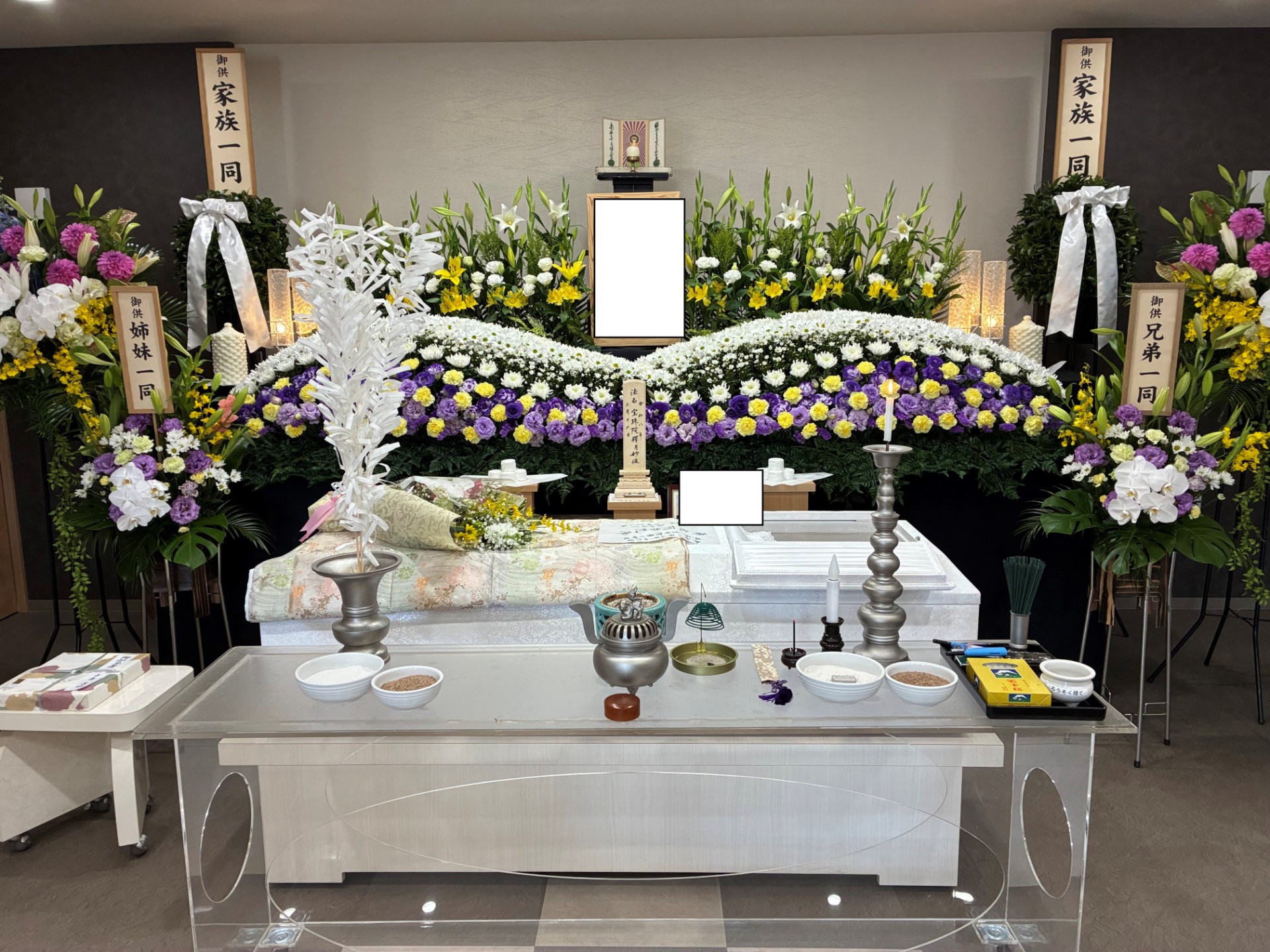 =つなぐ)祭壇です。故人様が好きだった、紫を中心に飾らさせていただきました