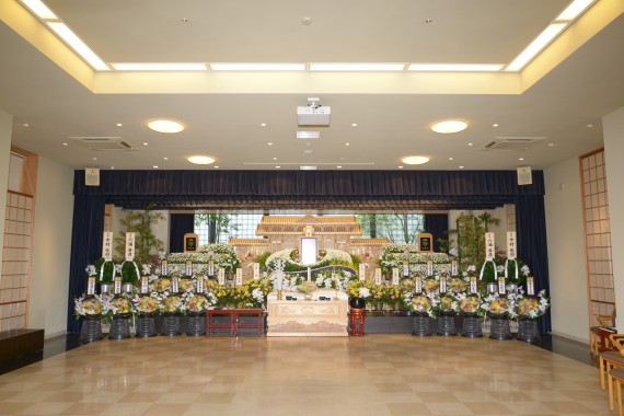 式場の舞台の端まで飾る祭壇です。今までの人生を称えた故人様にふさわしい祭壇であると担当者ながら感じます。また、供物もたくさんのお供えがあるため、多くの方々の尊敬の想いがあったのだと思います。