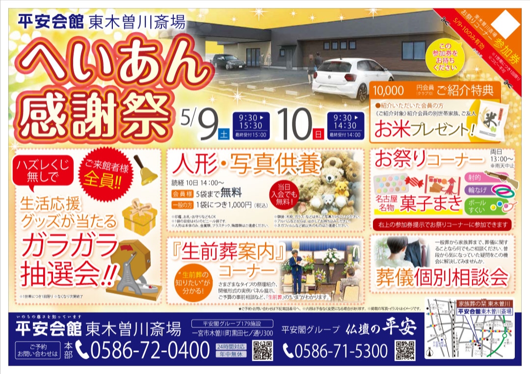 5月9日(土) 5月10日 (日) 平安会館 東木曽川斎場 見学会開催!